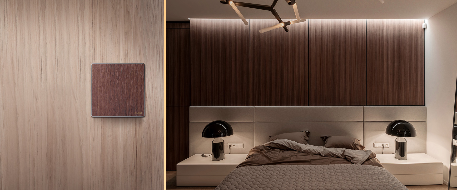 整體化的概念,安裝效率大大提升;(連體開(kāi)關(guān)貼在墻壁上) 落落大方,家居陳列有序,面板隨心組合